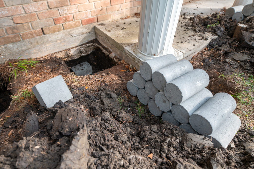 - Piling Installation: Using hydraulic pressure, we drive concrete cylinders (pilings) deep into the soil beneath your foundation until they reach stable soil or bedrock. This process ensures that the pilings provide the necessary support to stabilize the foundation.